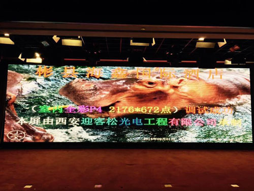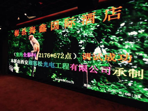 项目名称:彬县海鑫国际酒店P4 LED全彩屏项目 工程地点: 咸阳市彬县 产品型号:P4室内全彩显示屏 像素密度:62500点/㎡ 工程概况:该显示屏于2015年9月20日安装调试完工, 整屏显示面积为25平方米。
